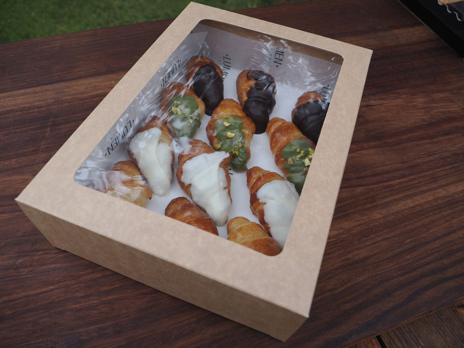 box de repostería de croissants con diferentes tipos: Chocolate, Chocolate blanco, Pistacho y normal